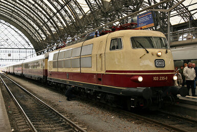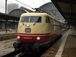 Eine Lokomotive der Baureihe 103 mit einem Sonderzug in Dresden Hbf | ||