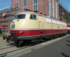 | 103 245-7 | ist die letztgebaute 103 und gehört ebenfalls dem DB Museum. Sie übernahm seit 2013 planmässig ein InterCity-Zugpaar zwischen Nürnberg–München sowie Sonderleistungen, z. T. auch nach Österreich. Seit Herbst 2014 verkehrte sie planmässig mit einem InterCity-Zugpaar zwischen München und Ulm. Seit Fahrplanwechsel 2016/17 wird die Lok nicht mehr planmässig eingesetzt. Eigentlich sollte die Lok Ende April 2017 an das DB Museum überführt werden, stand aber zunächst längere Zeit im Bw München Hbf abgestellt. Die Lok wird vom Münchener Lokomotiven Verein betreut. Die Lok wurde aus dem Bestand der DB gestrichen, wird aber seit dem 10. August 2017 dort wieder im Bestand geführt. Aktuell (Stand März 2018) ist die Lok aufgrund abgefahrener Radsätze nicht einsatzfähig. Im Jahr 2019 wurde die Maschine ins Ausbesserungswerk Dessau überführt, wo sie inzwischen ausgeachst wurde und nun auf Hilfsdrehgestellen auf neue Radsätze wartet. Die Lok war zuletzt DB Fernverkehr München zugewiesen und ging am 4. März 2020 endgültig in den Bestand des DB Museums über. 103 245 soll dem DB Museum Koblenz-Lützel als betriebsfähige Lokomotive für den TEE-Rheingold zur Verfügung stehen. | |