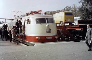 Öffentlichkeit im Juni 1965 auf der Internationalen Verkehrsausstellung (IVA) in München präsentiert. Die E 03 wurde in Anspielung auf ihre damals herausragende Leistungs-fähigkeit der Öffentlichkeit nicht als gewöhnliche Schnellzuglok, sondern als Schnellfahrlokomotive vorgestellt, eine Bezeichnung, die sich bis Ende der 1980er Jahre im Sprachgebrauch und zum Teil bis heute in der Literatur (hier als Schnellfahr-Ellok bezeichnet) halten konnte.Die Fahrten waren von zahlreichen Motorschäden begleitet. Nur durch den ständigen Tausch der noch nicht ausgereiften Motoren und die anschliessende Reparatur im Bahnbetriebswerk konnte der Fahrplan eingehalten werden. So stand die E 03 003 mit ausgebauten Fahrmotoren auf dem Ausstellungsgelände. Eine der fahrplanmässigen Loks war im Bahnbetriebswerk, eine stand auf Reserve und nur eine war mit Schnellzügen unterwegs. Trotz aller Probleme absolvierten die Lokomotiven der Baureihe E 03 während der IVA insgesamt 347 Demonstrationsfahrten mit 200 km/h.