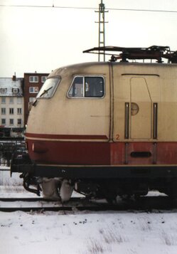 | 103 184-8 | ist bereits seit dem 18. Januar 2002 im Bestand des DB Museums aufgeführt und erhielt im gleichen Jahr einen Neuanstrich in purpurrot/elfenbein mit altem DB-Emblem an den Führerständen sowie die Beschriftung DB Museum Historische Verkehre. Die Lok kam mit dem TEE (Trans Europ Express) quer durch Deutschland zum Einsatz. Betreut wurde sie durch die Bahn-Werkstatt in Frankfurt am Main und ist dort beheimatet gewesen. Die Lok hat zudem für Fahrten in der Schweiz einen speziellen Strom-abnehmer erhalten, inzwischen kann sie dort nicht mehr fahren. Im Januar 2013 wurde sie von DB Fernverkehr übernommen. Seit März 2012 ist sie wegen abgefahrener Radsätze nicht einsatzfähig, ihre Frist lief im Juni 2013 ab. Am 11. Juni 2013 wurde sie ins Eisenbahnmuseum Darmstadt-Kranichstein überführt und zusammen mit 103 101 abgestellt. Am 19. November 2013 erfolgte eine Überführungsfahrt ins Werk Frankfurt-Griesheim. Die Zukunft ist derzeit ungewiss, so ist beispielsweise die Nutzung als Ersatzteilspender für 103 113 und 103 235 im Gespräch. Der momentane Standort ist das Bw Lichtenfels. | |